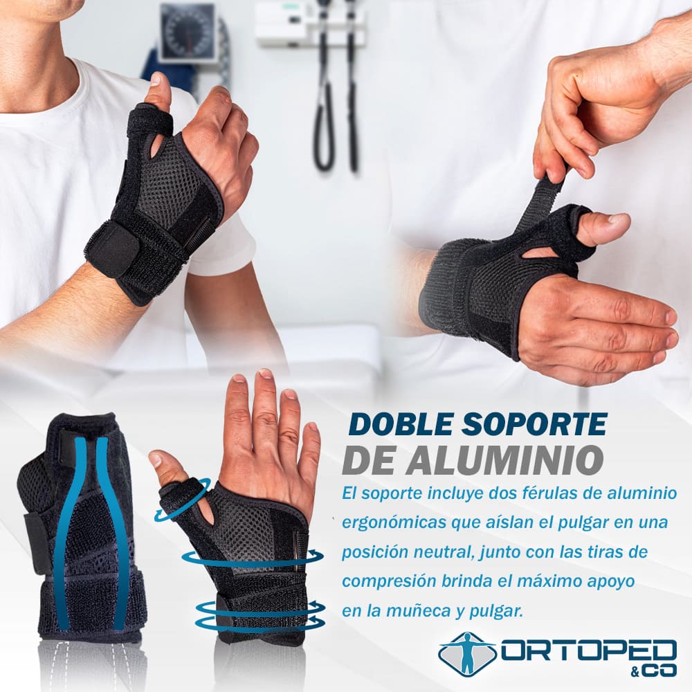 Aislando el pulgar en una posición neutra, el soporte incluye dos férulas de aluminio de diseño ergonómico para un máximo apoyo e inmovilización del pulgar.